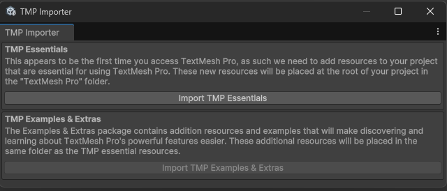 Text - TextMeshPro를 추가하면 Importer 창이 나오게 되는데 이때 Import TMP Essentials를 눌러 설치해줍니다.