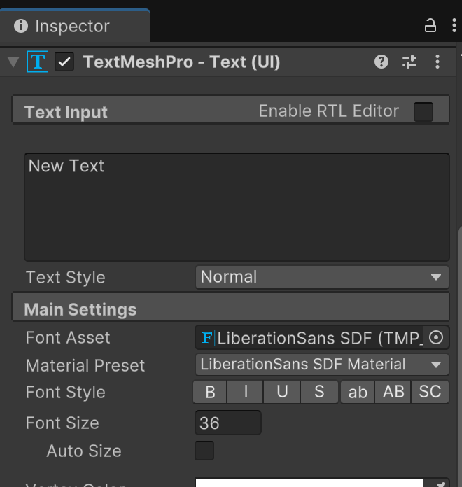 Font Size와 Font Style, Vertex Color(글자 색상) 등을 입맛에 맞게 수정해주세요.
