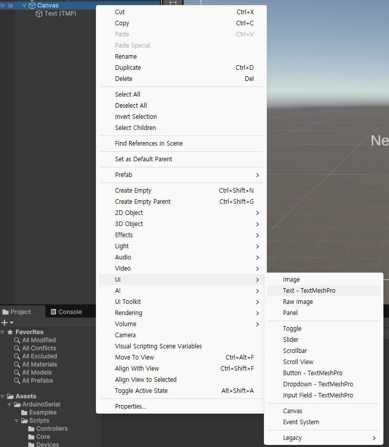Canvas 오브젝트에서 마우스 오른쪽 클릭 - UI - TextMeshPro를 추가합니다.