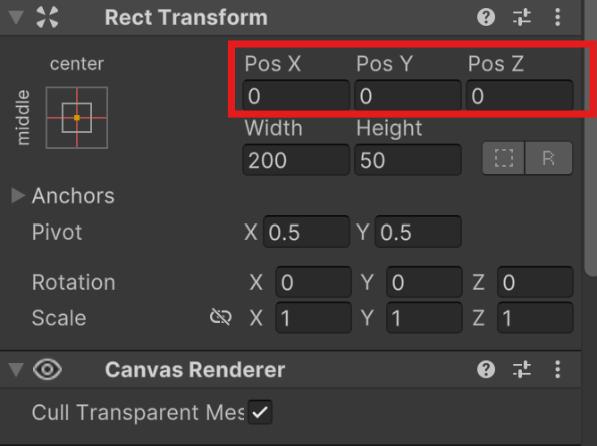 - 옮길 오브젝트를 선택 후 Inspector의 Rect Transform의 Pos X, Pos Y, Pos Z의 값을 변화(여기서는 Pos Z는 고정)